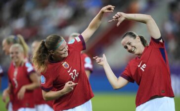 Norway's Signe Gaupset (left) celebrates with team-mate Elisabeth Terland after scoring their side's ... More first goal of the game...