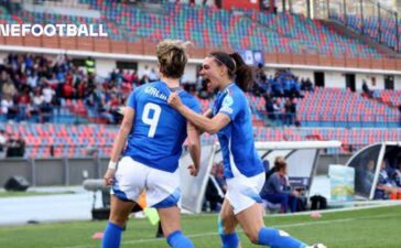 Valentina Giacinti of Italy celebrates with a teammate after scoring the first goal. (Photo by Maurizio Lagana/Getty Images)Match day 1...
