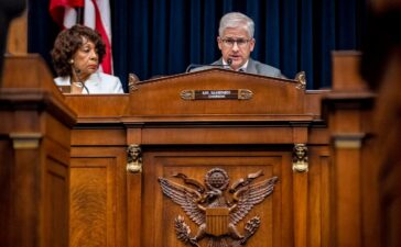 Chairman Rep. Patrick McHenry, R-N.C., right, accompanied by Ranking Member Rep. Maxine Waters, ... D-Calif., left, speaks as Federal Reserve...