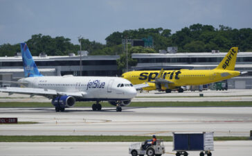 FILE - A JetBlue Airways Airbus A320, left, passes a Spirit Airlines Airbus A320 as it taxis on the runway,...