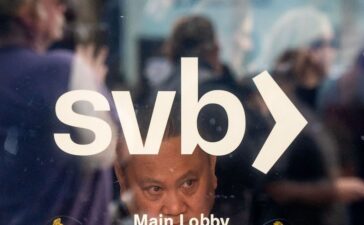 A security guard looks out a door as customers line up at Silicon Valley Bank headquarters in Santa Clara, California...