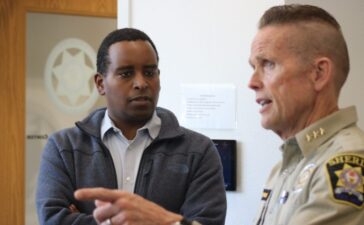 Summit County Sheriff Jaime FitzSimons (right) speaks with U.S. Congressman Joe Neguse (left) at the Summit County Emergency Operations Center...