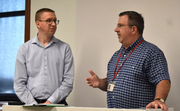 T-R PHOTOS BY ROBERT MAHARRY —Marshall County Attorney Jordan Gaffney, left, and YSS of Marshall County Director David Hicks address...