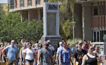 FILE - Pedestrians cross University Ave on the campus of Arizona State University in Tempe, Ariz., July...