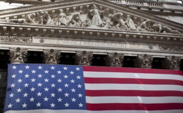 NEW YORK - JUNE 5: An American flag hangs off the front of the New York Stock Exchange in New...