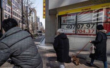 People walk past an electronic board showing a share price of the Nikkei index of the Tokyo Stock Exchange in...