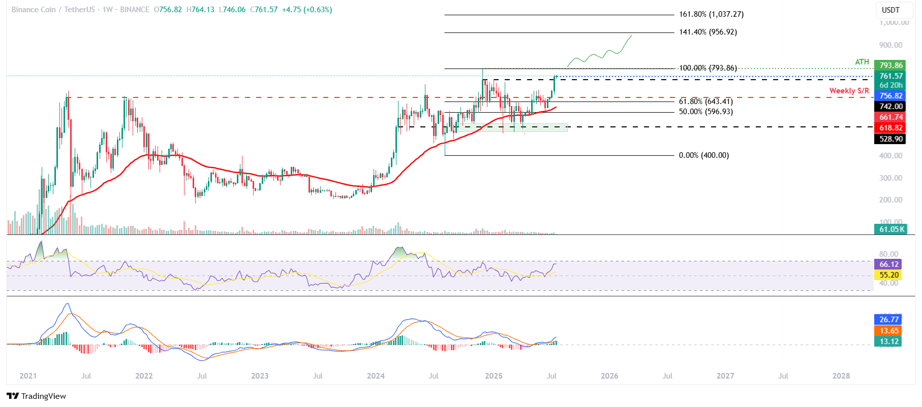 BNB (BNB), formerly known as Binance Coin, continues to trade higher above $762 at the time of writing on Monday after closing at its highest-ever weekly level and gaining over 9% last week. Derivatives data support a bullish thesis as Open Interest (OI) hits a yearly high of $1.05 billion, reflecting renewed investor interest. The technical analysis also suggests a continuation of the rally, targeting its all-time high of $793.86 and potentially entering a price discovery mode.