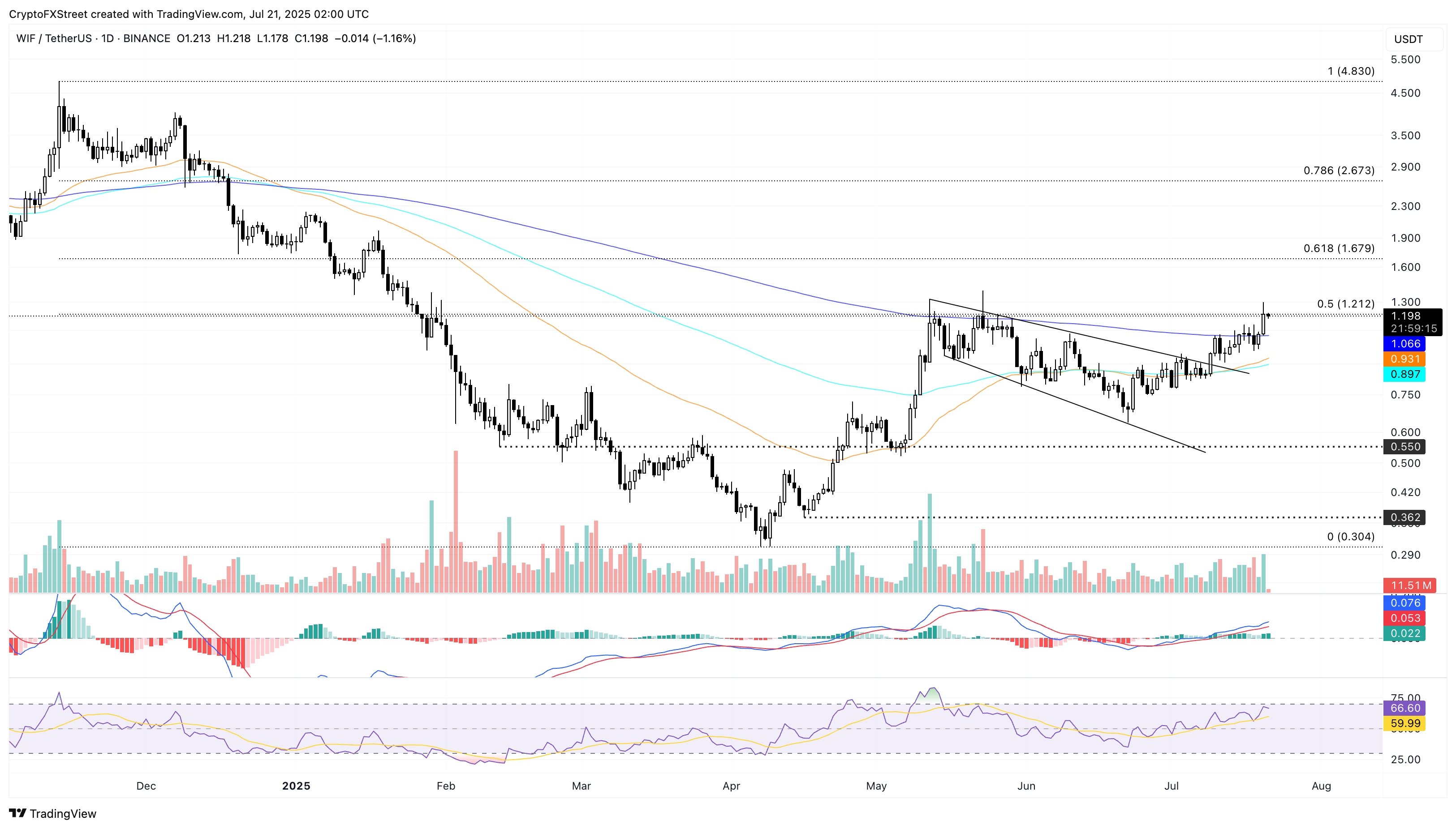 Dogwifhat (WIF) edges lower by 1% at press time on Monday following its 12% rise from Sunday. The bullish run in WIF surpasses the 200-day Exponential Moving Average (EMA) and targets a crucial resistance level at $1.212. Both the technical and derivatives data indicate a bullish inclination as trend momentum increases and Open Interest hits a yearly high, inching closer to $600 million.