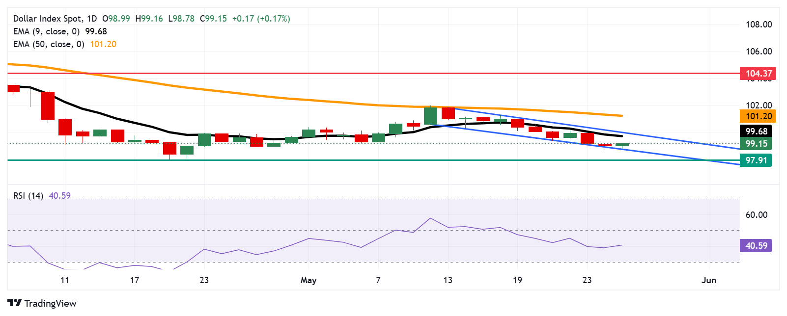- The US Dollar finds primary support at the lower boundary of the descending channel around 98.70.