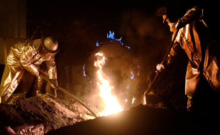 Workers of German steel manufacturer Salzgitter AG stand in front of a furnace at a plant in Salzgitter, Germany, March 1, 2018.