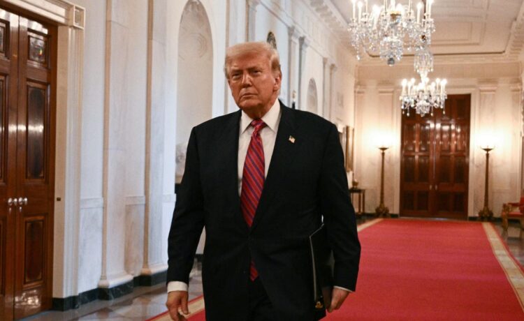 US President Donald Trump arrives to sign the GENIUS Act (Guiding and Establishing National Innovation for US Stablecoins Act), which codifies the use of stablecoins — cryptocurrencies pegged to stable assets like the US dollar or US bonds — in the East Room of the White House in Washington, DC, on July 18, 2025. (Photo by Brendan SMIALOWSKI / AFP) (Photo by BRENDAN SMIALOWSKI/AFP via Getty Images)