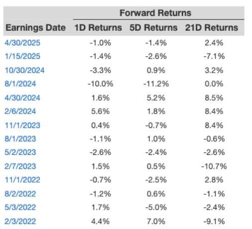 - There are 20 earnings data points recorded over the previous five years, with 9 positive and 11 negative one-day (1D) returns noted. Overall, positive 1D returns occurred roughly 45% of the time.