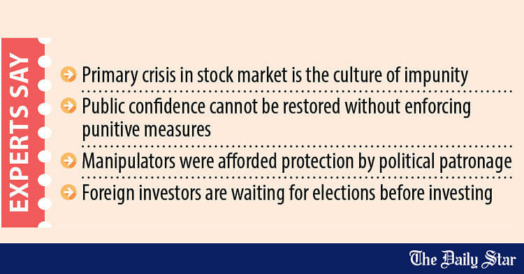 The primary crisis plaguing the stock market is a culture of impunity, which has severely affected numerous investors. As such, public confidence cannot be restored without enforcing punitive measures against manipulators and ensuring good governance, said Debapriya Bhattacharya, a distinguished fellow at the Centre for Policy Dialogue (CPD).