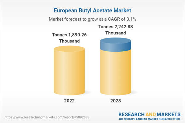 Europe is experiencing a notable surge in the Butyl Acetate market, with an impressive volume already recorded in 2022. This uptick is anticipated to maintain a steady Compound Annual Growth Rate (CAGR) of 3.07% leading up to 2028. The market is projected to reach a substantial volume of 2242.83 thousand tonnes by the end of the forecast period. Butyl Acetate, a solvent that boasts of natural occurrence and wide applications, has made formidable strides across industries in Europe. Butyl Acetate, known for its distinctive fruity aroma, is used as a flavoring agent in multiple food products and as a solvent that plays a pivotal role in various sectors including pharmaceuticals, personal-care products, paints and coatings, and electronics, to name a few. The demand for said solvent has seen a consistent rise especially within the coatings and paints industry and the realm of flavorings, positioning Butyl Acetate as a chemical of considerable importance.